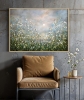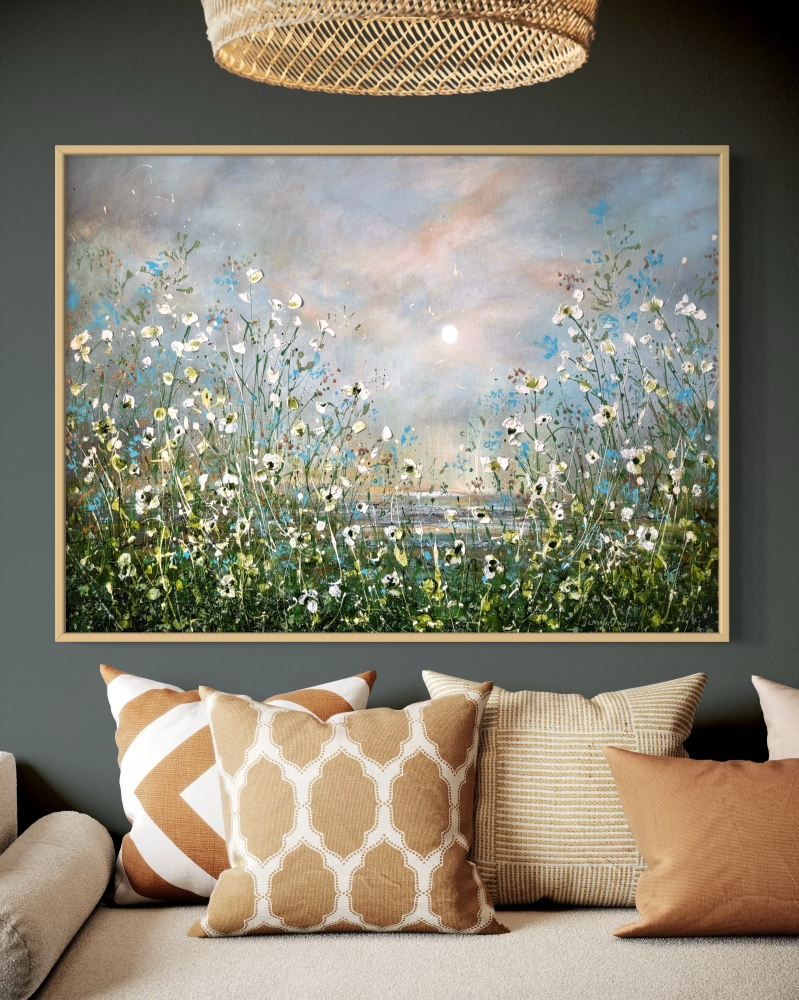 A vibrant, yet subtle spring scene of the South Downs, featuring distant, lush rolling hills are accompanied by beautiful blooming flowers under soft, drifting clouds. The artwork captures the fresh energy of spring with colourful blossoms and serene sky, evoking the peaceful countryside atmosphere of the beautiful South Downs. A palette of beautiful soft blues, greens, white and cream come together in this piece. Accented by subtle shimmering gold and copper accents. Whilst Wild white poppies, plants, leaves, petals and stems are delicately painted, that dance around the canvas. Painted with imagination and feeling. Looks beautiful hung above the bed, fireplace or sofa. Arrives ready to hang an enjoy..