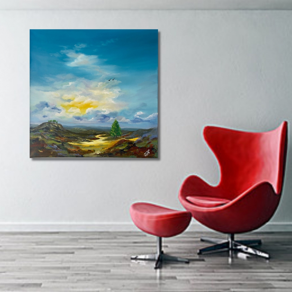 A single winding path draws the eye into the distance, while a lone tree and two birds evoke solitude and serenity. The soft earth tones and expressive sky create a grounding presence that brings peace to any space.