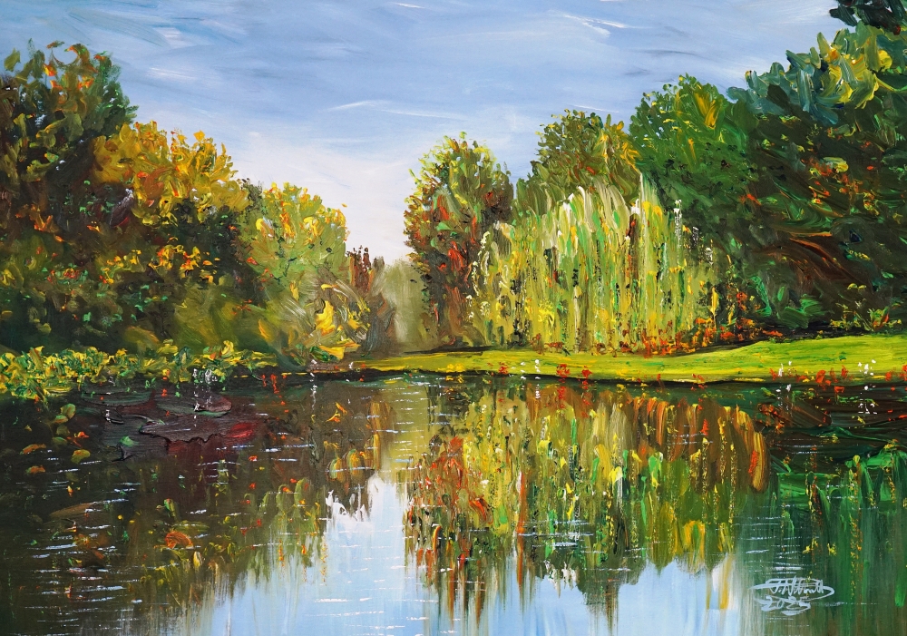 The trees are reflected in the lake's water, the summer sun is shining. In the foreground is the lake water, reflecting the many hues of the different trees along the shore, which are located in the middle ground of the painting. In the background is a pleasant summer sky. The scenery radiates harmony and serenity; immersing oneself in the landscape, the viewer can imagine a romantic, touching moment to pause and enjoy...