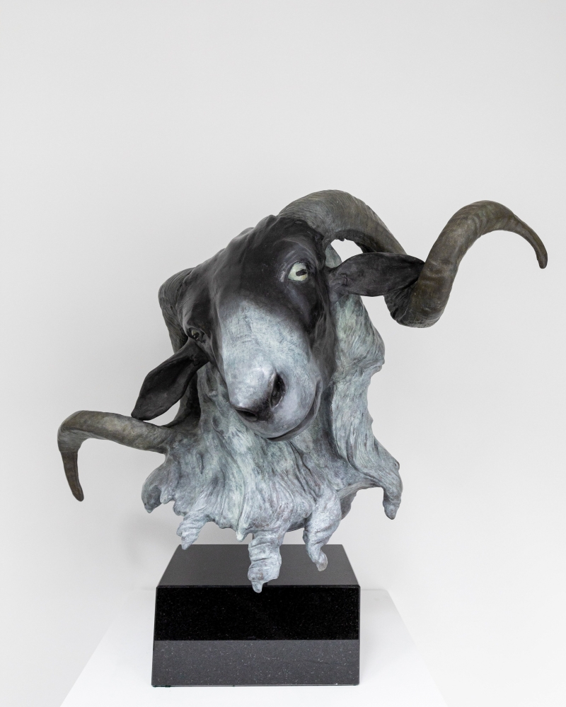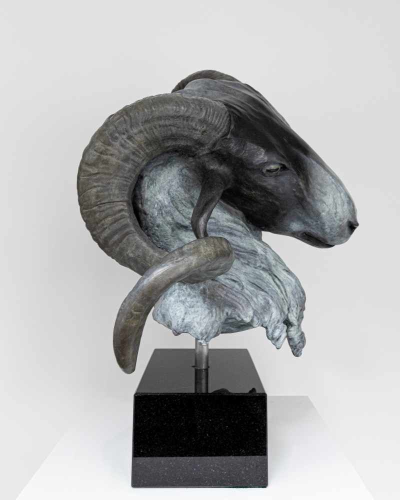 This portrait bust of a Scottish blackface ram that occupies an active use of space, is the ideal subject matter for a dynamic, bold yet serene bronze sculpture. The ram's magnificent horns wildly spiralling out from this sculpture command attention from the viewer. It is well balanced from every viewing position, offering his right eye as a focal point. The eyes were portrayed masterful but kind - an appealing combination for a sculpture. Cast in bronze in a limited edition of 9 the ram's head was and is the bronze sculpture that Davies exhibited at his exhibitions that truly and genuinely astonished the public with its intoxicating sense of presence.