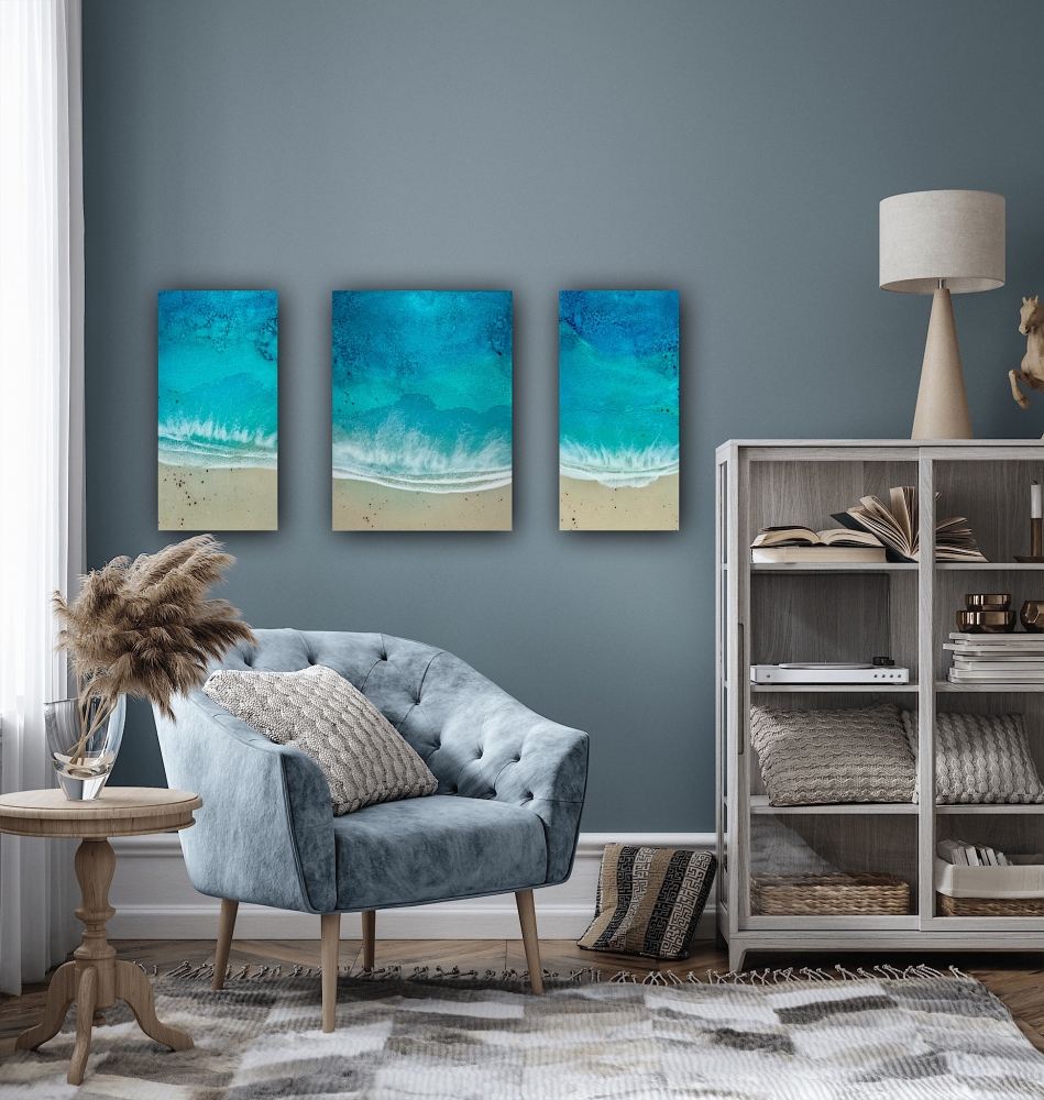 This piece captures a serene beach scene with soft, powdery sand and calm, translucent ocean waters. Frothy waves gently touch the shore, evoking a sense of freedom, comfort, and self-acceptance. It’s a visual escape—a place of peace and healing, both for me and for those who invite it into their space.