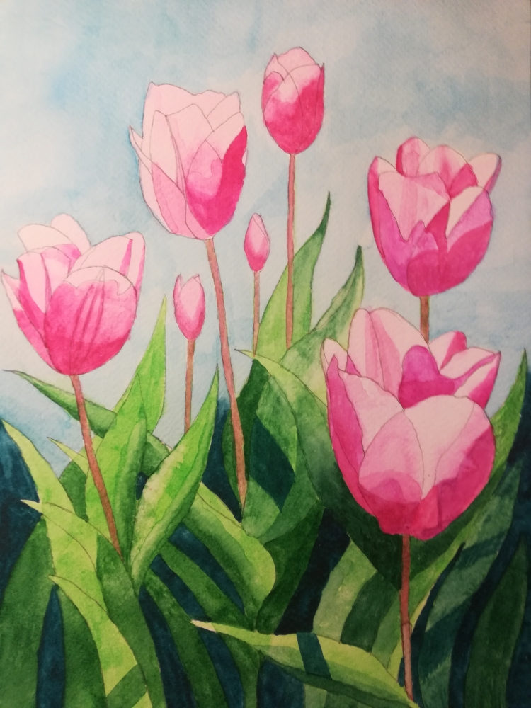 A watercolour depiction of pink tulips and their green leaves in the spring sunshine. Unframed and measures exactly A4.