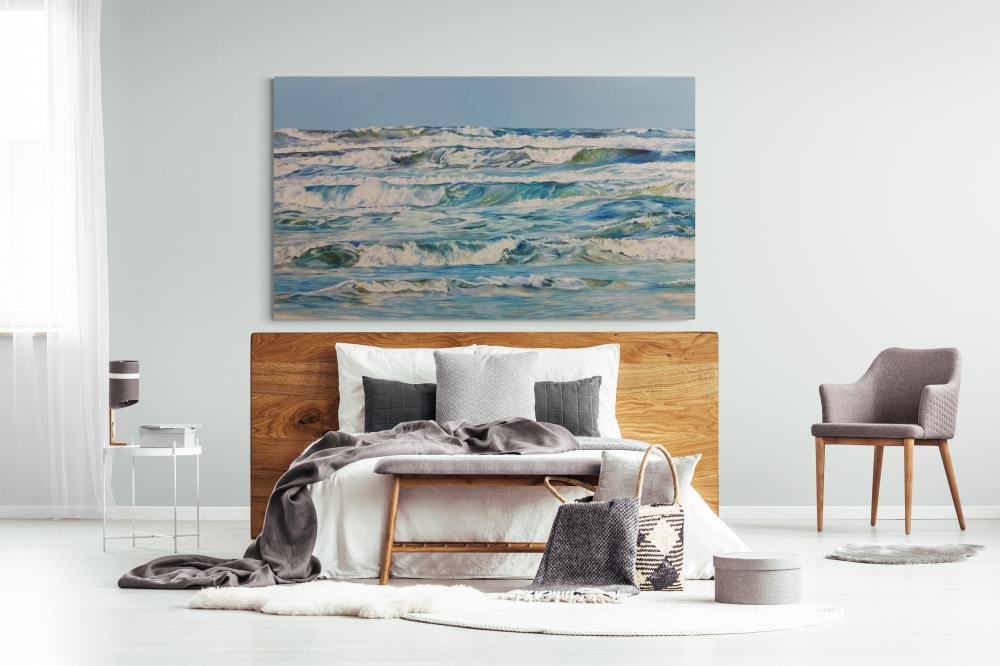 A large striking gallery wrapped oil on linen canvas supplied ready to hang. The painted image extends around the outer perimeter of the robust deep profile canvas so no additional framing is necessary.