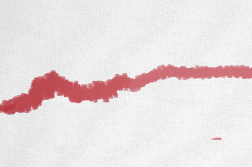 This digitally painted artwork features a bold minimalist composition with a bold, red, wavy line extending across a white textured canvas. The line varies in thickness, value, and texture, exhibiting a fluid movement from left to right. The line has an irregular, textured appearance, suggesting a dynamic and spontaneous motion across the canvas.There is a smaller gesture lower right. The piece uses a simple color palette emphasizing the contrast between the vibrant red and the plain white background. The overall effect is abstract and dynamic.