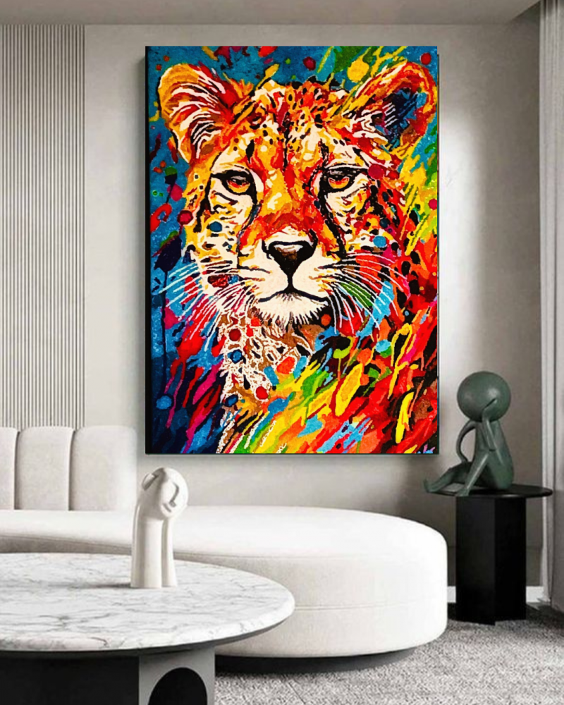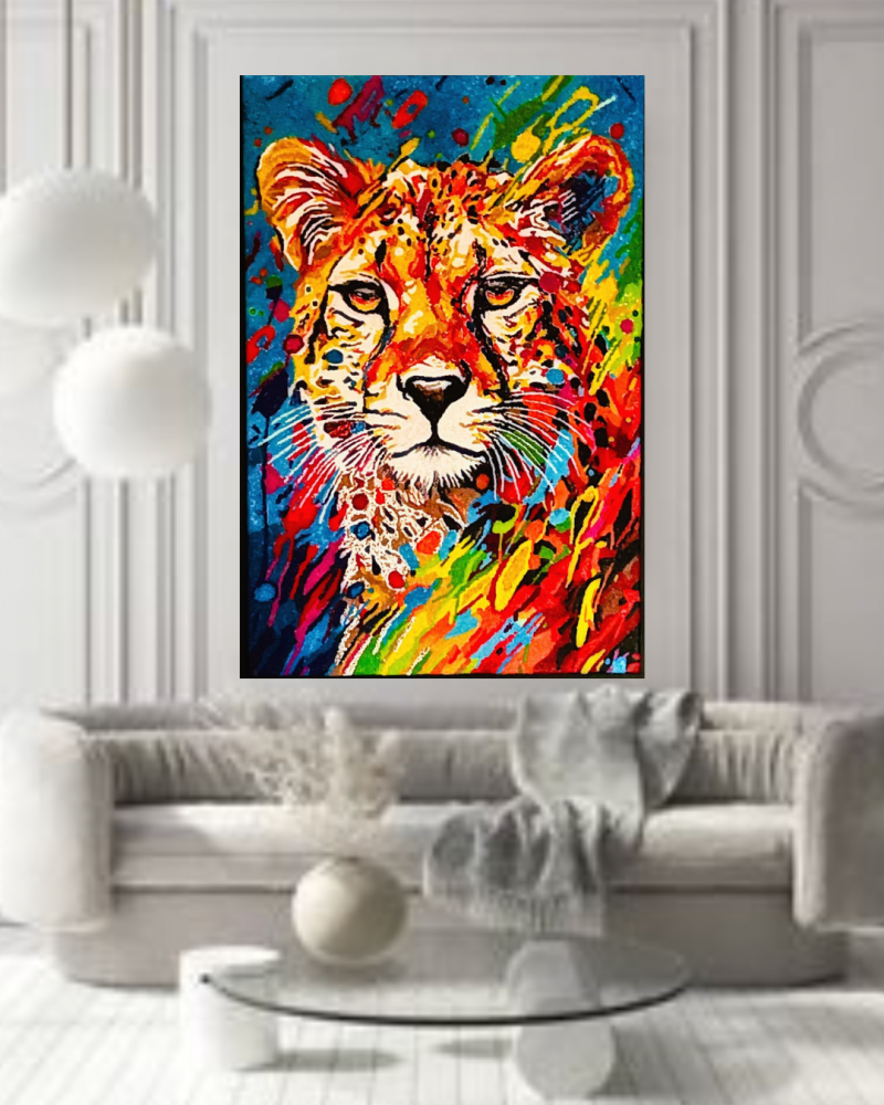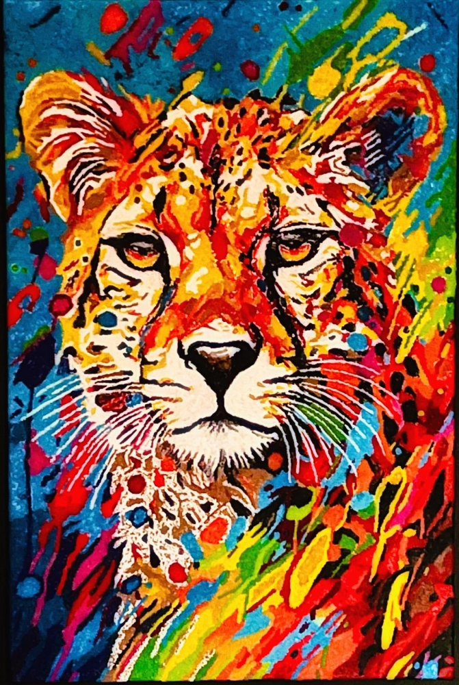 This electrifying painting captures the essence of a cheetah in a blaze of vibrant colour and explosive energy. With piercing eyes and a poised expression, the cheetah radiates power, grace, and determination. The background erupts in a flurry of rainbow hues and splattered patterns, suggesting speed, motion, and the untamed spirit of nature. The fusion of realism and abstraction evokes both the beauty of the animal and the chaos of the wild, making this artwork a celebration of raw vitality and primal elegance.