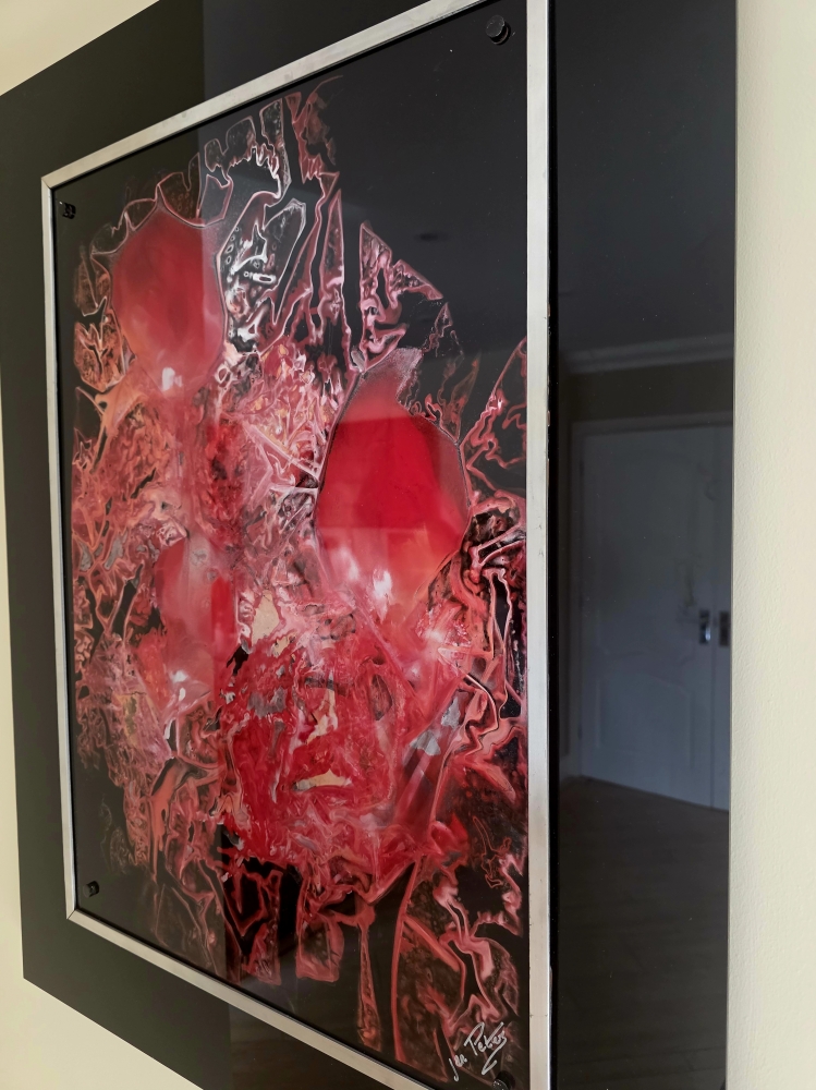 Captivating and dramatic, this original painting (one-off with no prints) on acrylic glass captures attention. Viewing through the glass creates an unusual depth of colour and reflections which engage and seemingly enlarge your room space. So different.